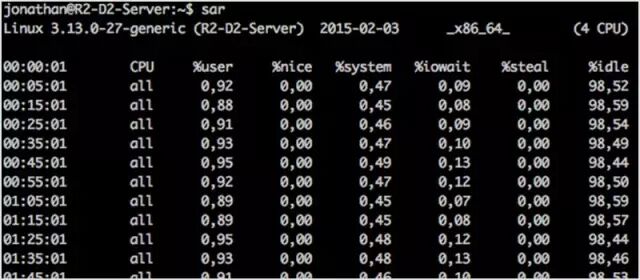 sar 是 sysstat 包的一部分,可以帮助你收集、报告和保存不同系统的指标。使用不同的参数,它会给你提供 CPU、 内存和 I/O 使用情况及其他东西。