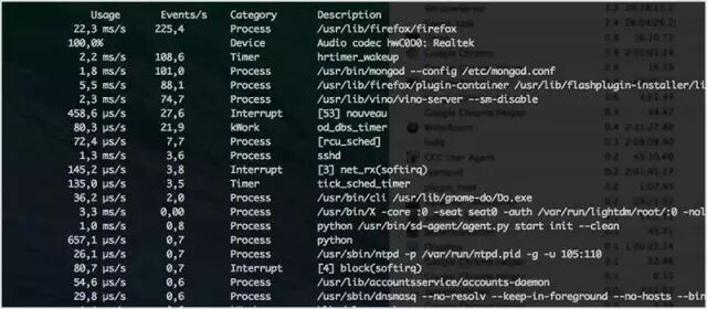 powertop 可以帮助你诊断与电量消耗和电源管理相关的问题。它也可以帮你进行电源管理设置,以实现对你服务器最有效的配置。你可以使用 tab 键切换选项卡。