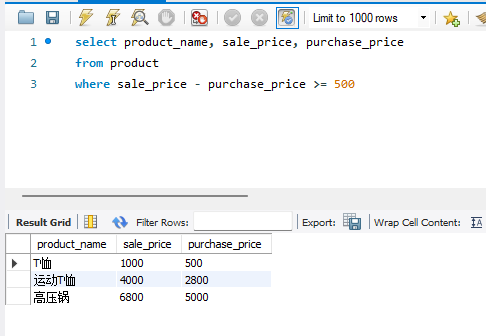 3,章节中的SELECT语句能够从 product 表中取出“销售单价(sale_price)比进货单价(purchase_price)高出500日元以上”的商品。请写出两条可以得到相同结果的SELECT语句。执行结果如下所示: