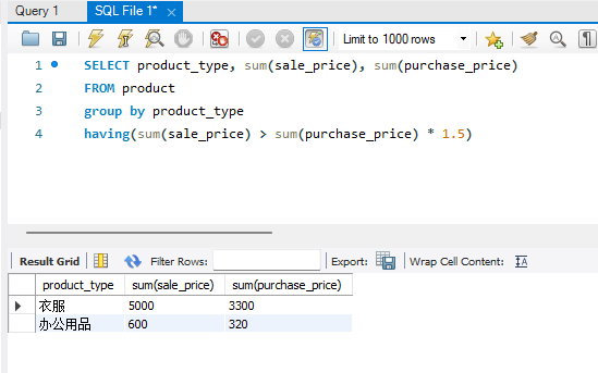 2.5, 请编写一条SELECT语句,求出销售单价( sale_price 列)合计值大于进货单价( purchase_price 列)合计值1.5倍的商品种类。执行结果如下所示。