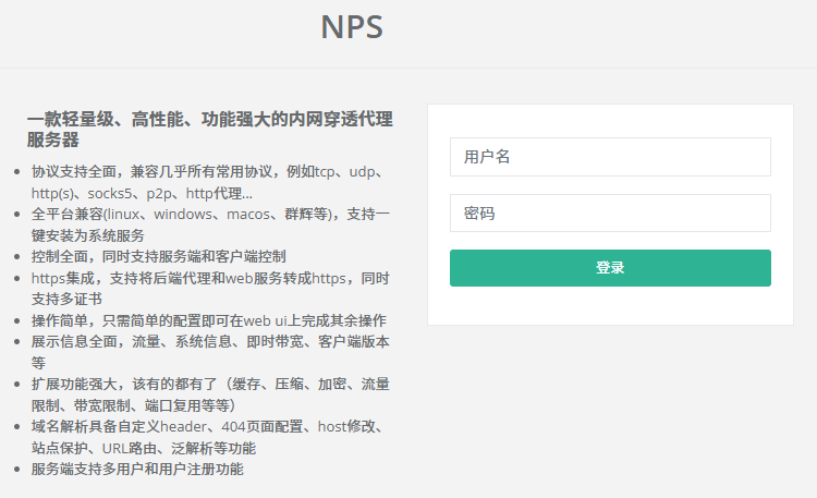 NPS是一款使用Go语言开发的轻量级、高性能、功能强大的内网穿透代理服务器。其主要优势包括:- 全能协议支持:全面支持TCP、UDP、HTTP(S)、SOCKS5、P2P等多种协议。