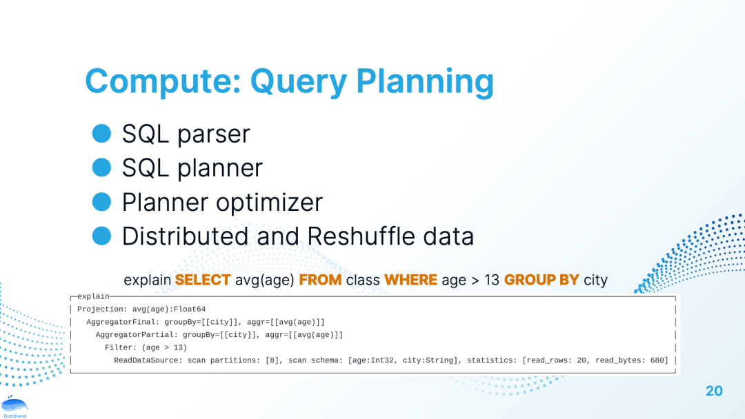 执行计划从下向上看,首先是最下面要读取的数据源信息。上面例子中显示,读取8个分区、读20行数据。倒数第二行是做过滤,满足年龄>13条件的数据会先筛选出来,且Filter语句是一个下推语句。再上面是Group by,会看数据扫描的区间大小。如果扫描区间是成百上万的,这个操作会是一个分布式地执行的操作;或是根据数据的字段做shuffle,例如city字段在某几个节点上只计算北京、某几个只计算上海。