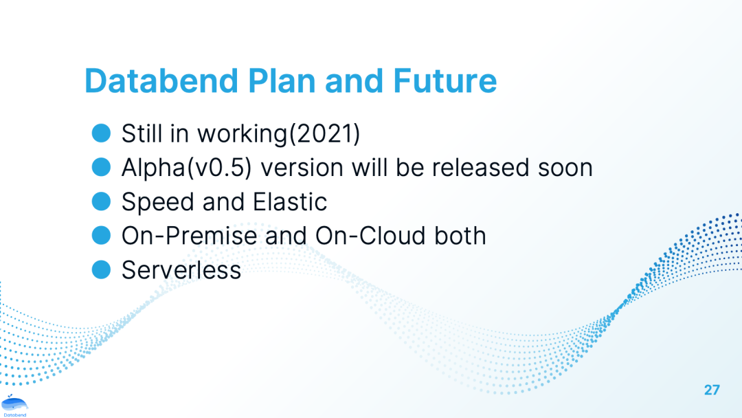 Databend的目标不会改变,始终追求性能和弹性。随着云基础设施越来越完善,大家对按量付费和弹性的需求非常强烈。Databend 既可以云端部署也可以私有化部署。