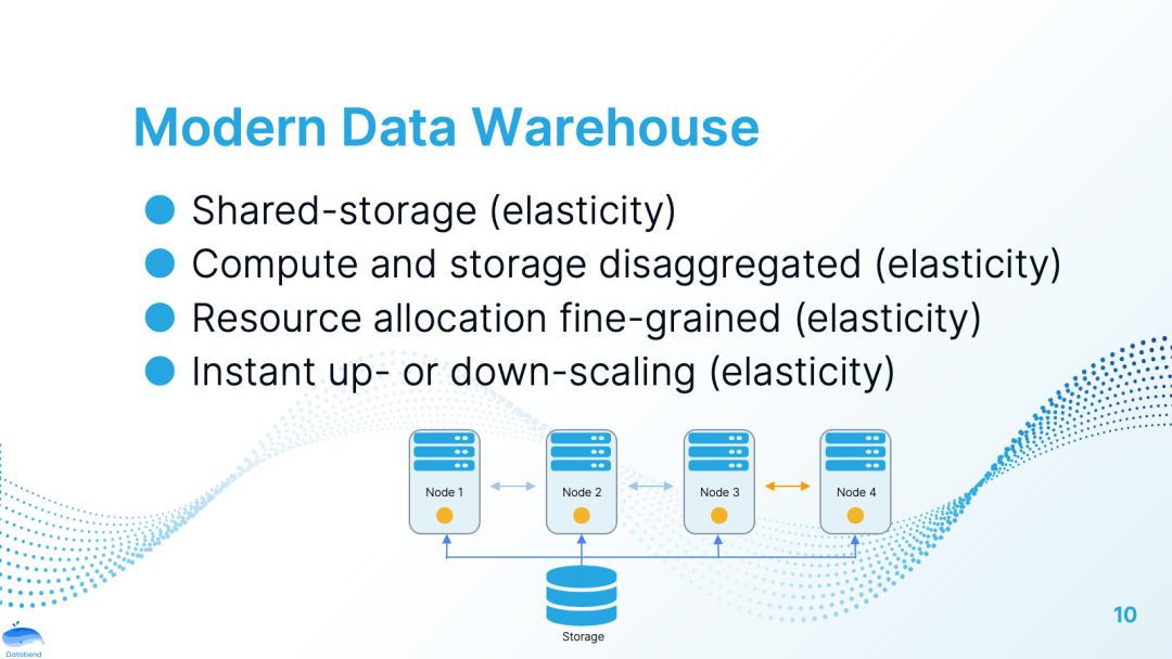 现在云平台的基础架构越来越先进,分布式文件系统也越来越稳定和高效。费用也在越来越低,这也给了我们构建新一代数仓带来了很多技术红利。现代云数仓 Databend 具备: