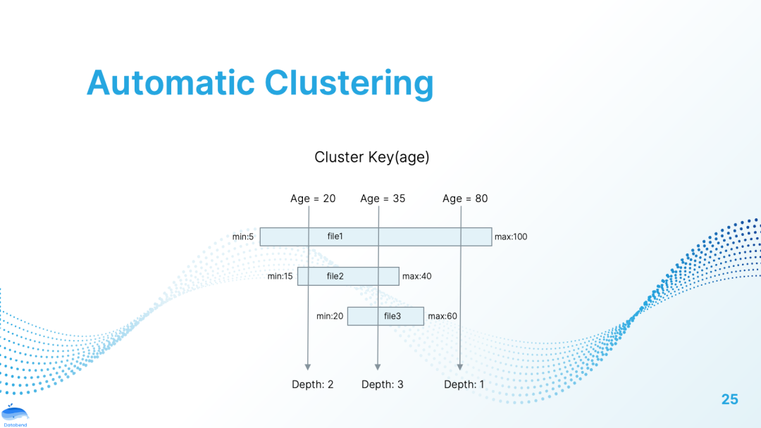 例如下图中的查询。查询年龄20时,击穿(查询)了2个文件,深度为2。当查询年龄为35时,击穿文件数量为3,深度为3。当查询年龄为80时,击穿文件数量为1,这种状态比较理想。如果业务上经常需要查询年龄35,且文件击穿的深度较深,这种情况下databend会感知到文件需要合并。文件1、2、3和文件35相关的内容会被合并成1个或深度更薄的几个文件。再次查询年龄35时读取文件变少,读取数据速度变快。