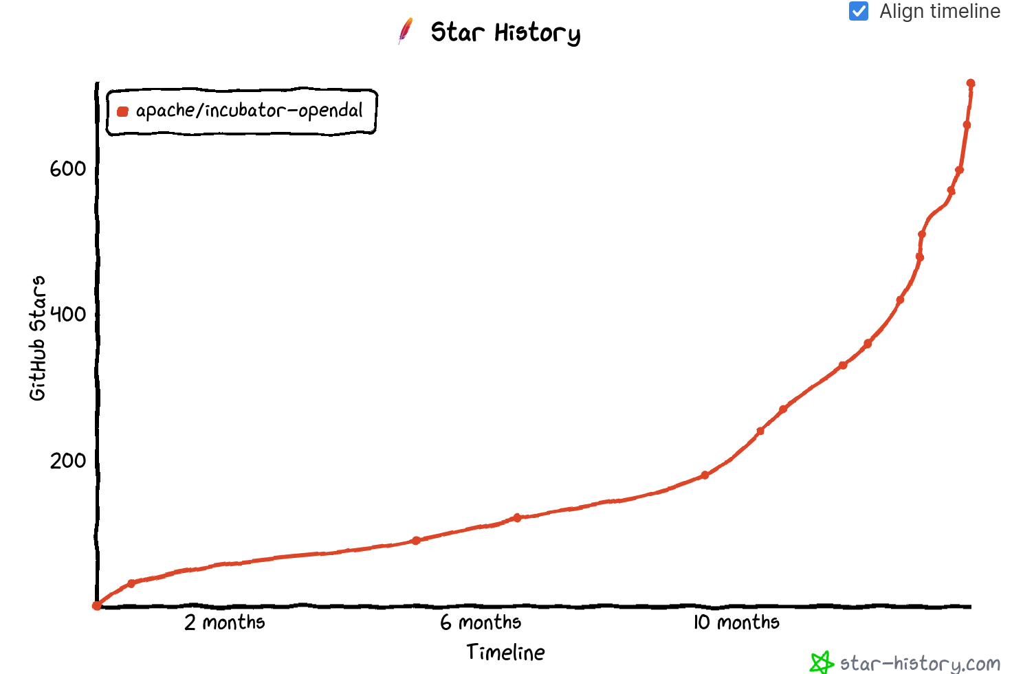 OpenDAL 自开源以来累计发版 99 次,Github Star 700+, 累计下载次数 349 K, 累计开发者共计 48 位,项目一直处于活跃更新状态,由衷感谢每位贡献者的努力和付出。