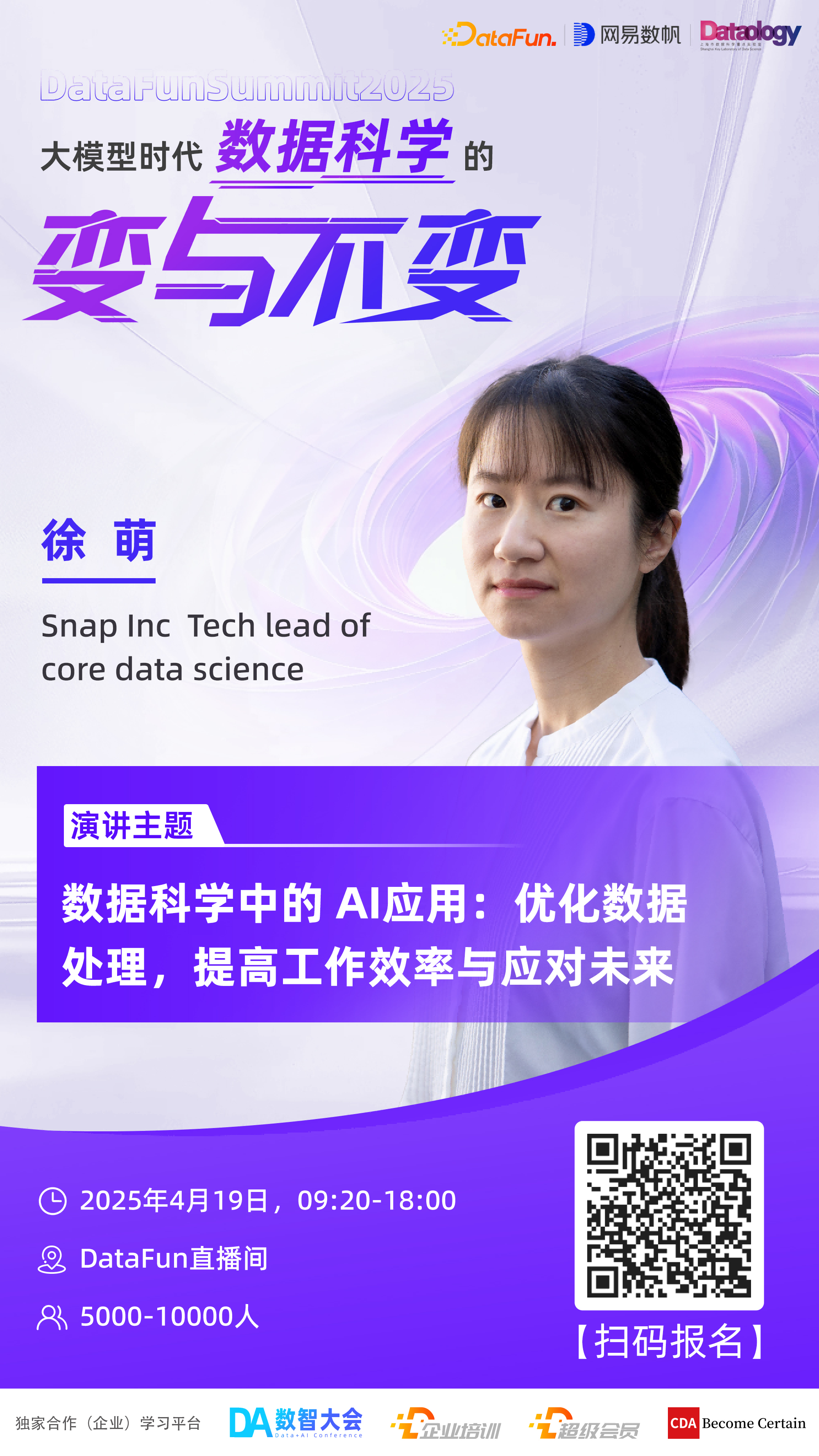 在4月19日上午的大模型时代数据科学的变与不变论坛,Snap Inc. 的Tech lead of core data science徐萌老师将出席此次会议,并带来主题分享: