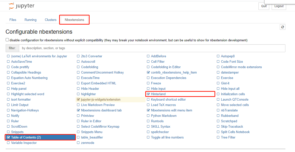 5.打开jupyter后点击Nbextensions标签,启用自动补全功能【table of Contents】和【Hinterland】