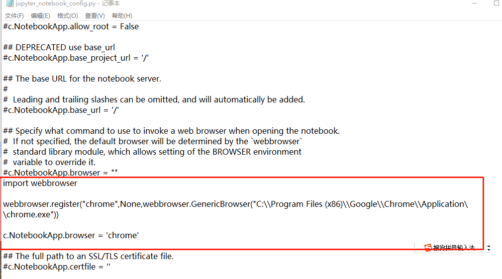 4.在打开的jupter_notebook_config.py文件中找到#c.NotebookApp.browser="",在改语句下面另起一行,输入如下命令: