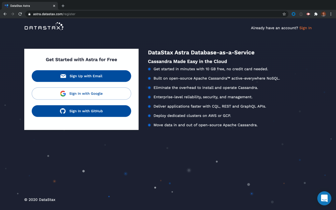 在DataStax Astra上创建一个永久免费的Cassandra数据库:https://astra.datastax.com/register