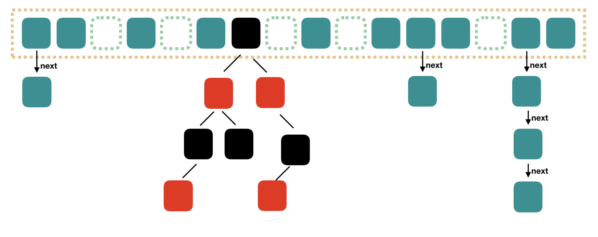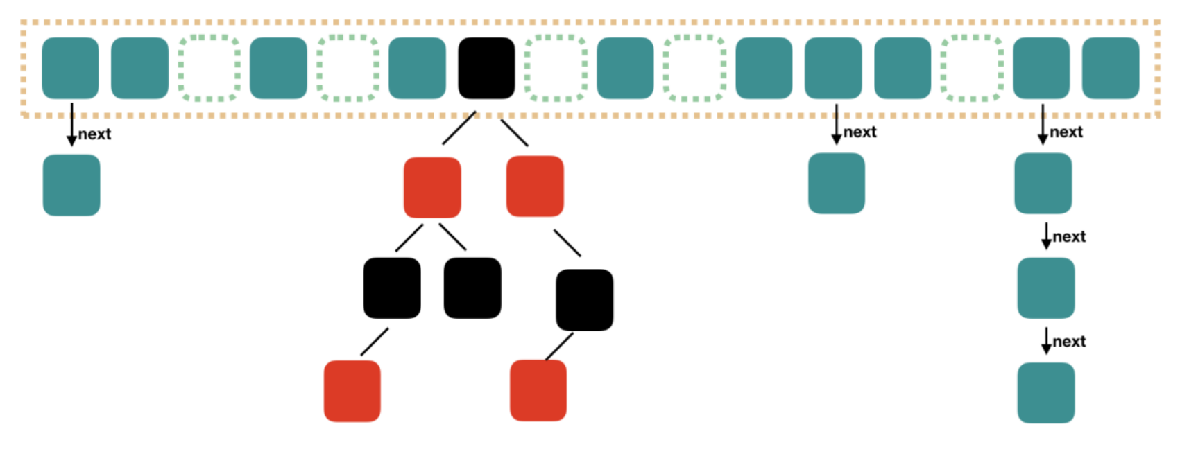 总结一下就是:链表取元素是从头结点一直遍历到对应的结点,时间复杂度是 O(N) ,红黑树基于二叉树结构,时间复杂度为 O(logN) ,所以当元素个数过多时,用红黑树存储可以提高搜索的效率。但是单个树节点需要占用的空间大约是普通节点的两倍,所以使用树和链表是时空权衡的结果。