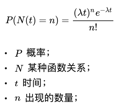 泊松分布就是描述某段时间内,事件具体的发生概率。柏松分布可以通过平均数估算出某个事件的出现概率。公式如下,此处对泊松分布不做详解,有兴趣的同学自行百度。
