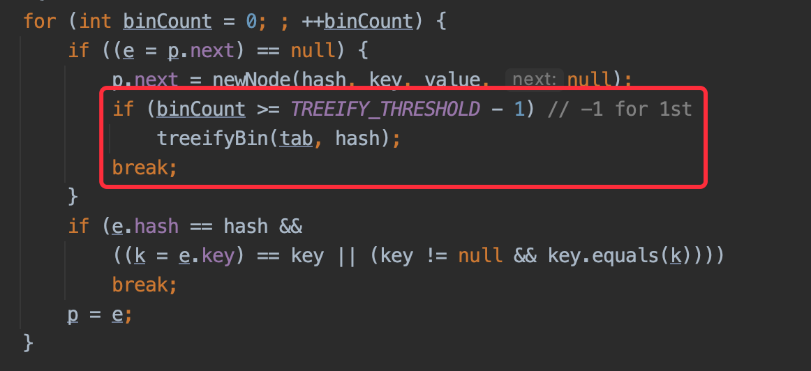 由这段代码可以看出,当链表长度大于 TREEIFY_THRESHOLD = 8 时,会进行树化。
