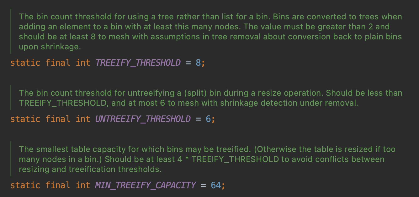 这里三个值分别代表:树化阈值 = 8 ,反树化阈值 = 6,hash 表中最小数据值 = 64。