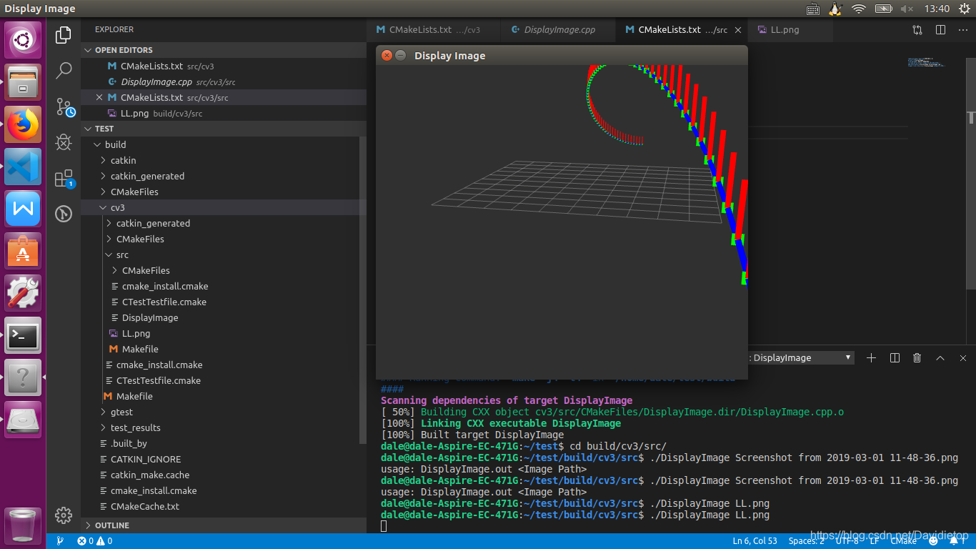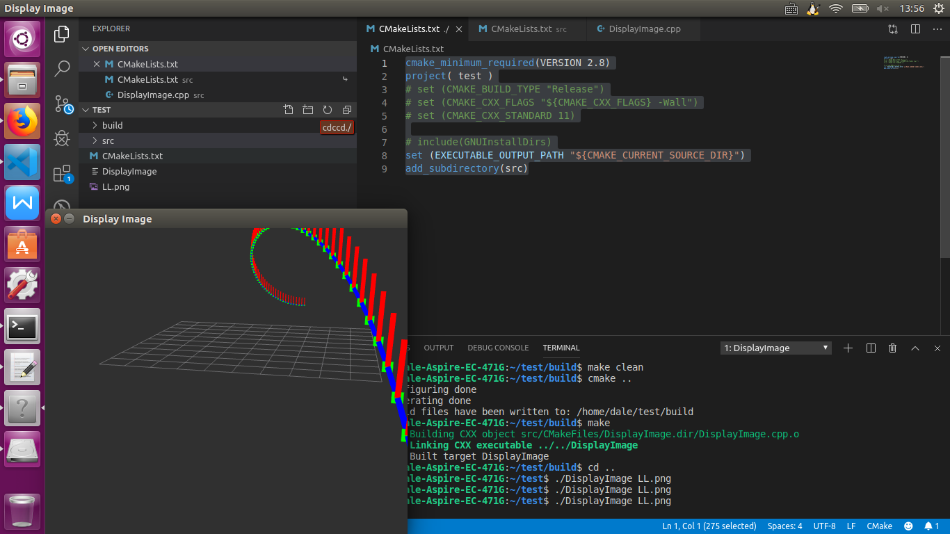 然后再在src里面编写你的程序,如Opencv教程里面的一个显示图像程序,以及编写一个CMakeLists.txt文件(见链接https://docs.opencv.org/3.4.7/db/df5/tutorial_linux_gcc_cmake.html)。