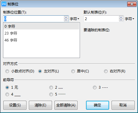 分别设置左对齐0、居中23、右对齐46,这是用了Tap键后各个区域位置,估计版面也就50多字符。
