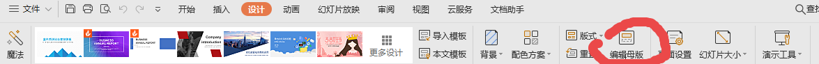 打开所要修改的ppt,点击工具栏里面的设计,看到编辑母版一项。