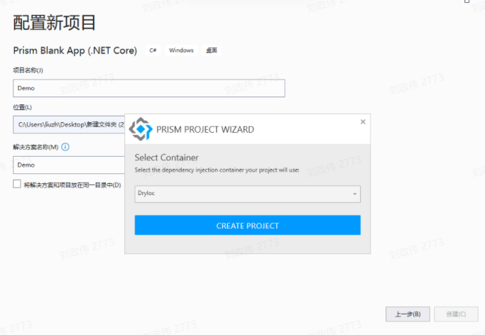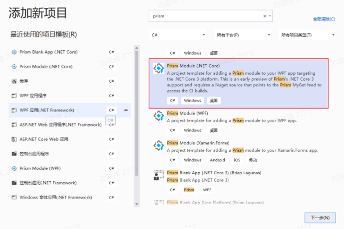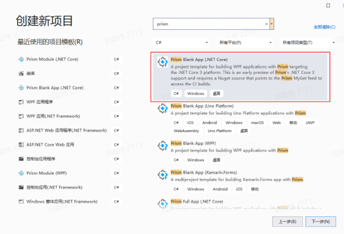 1,安装完准备工作中的插件,会增加出Prism相关的项目模板,选择合适的模板创建项目