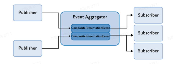 EventAggregator提供多播发布/订阅功能。这意味着可以有多个发布服务器引发同一事件,也可以有多个订阅服务器侦听同一事件。