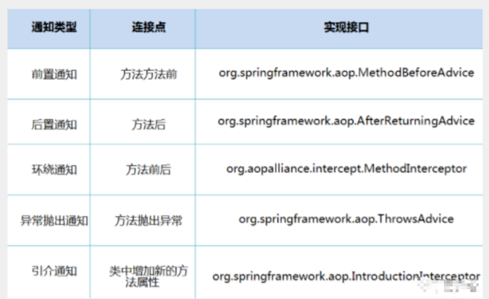 SpringAOP中,通过Advice定义横切逻辑,Spring中支持5种类型的Advice: