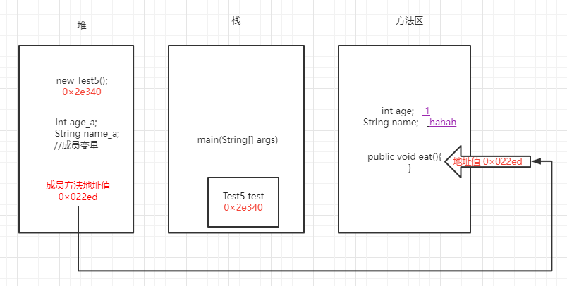 当 执行到 Test5 test5=new Test5() 时 会在栈中创建Test5类的引用 然后将成员变量跟成员方法 放入实例中(堆) 都是成员变量跟成员方法的地址值