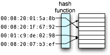 哈希冲突:在存储数据时使用数据的某些字段直接通过HASH函数映射成存储地址,这样的好处是查找该数据时可直接通过HASH函数计算出该地址,并直接找到该数据.但由于哈希函数的多对一的特性,会出现多个数据映射到同一个地址的可能(冲突的概率取决于HASH函数的选取,采取适当的HASH函数可以将这种可能性降到非常低,例如上述对两个非常大的指数求余的操作,一般认为不会重复)由于HASH函数的多对一本质特性,HASH冲突总是存在.对于MAC芯片硬件而言,产生哈希冲突的帧会被丢掉从而学不到对应的MAC地址.使用TCAM则可以避免哈希冲突问题,或者在出现哈希冲突的时候,改用TCAM.