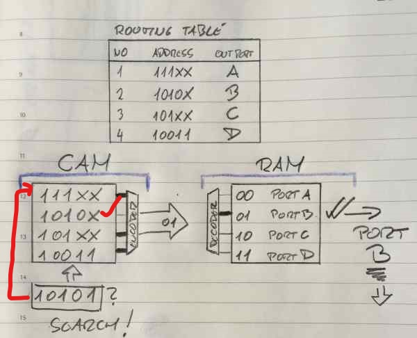 在查找某一地时候,需要对所有CAM存储器都通上电,初始的时候,所有的地址存储单位都输出“匹配”-True的状态,只要该路上有一个字节不匹配,则该路的输出将变为“不匹配”-False的状态,即同一时刻对所有的存储硬件进行匹配,最后只有一路维持电路上通的状态,实现了硬件上的一次性快速查找.