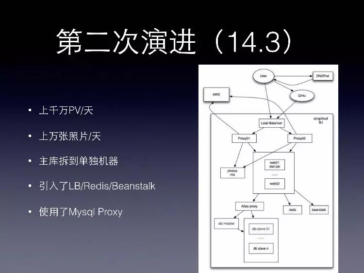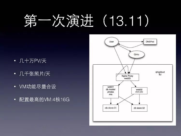 第一次演进的时候服务器架构调整是这样,我们在青云上面开了五台虚拟主机,第一台虚拟主机是做Nginx代理,同时提供Web业务的服务;还有另外两台虚拟主机,基本上囊括了除了DB、Slave以外的其他的所有的功能,包括做Web业务的处理,做DB的主库,做图片的存储,做Mis系统的后台,还有一台就做一些日常的统计的Job,最后再加上两台DB的Master。