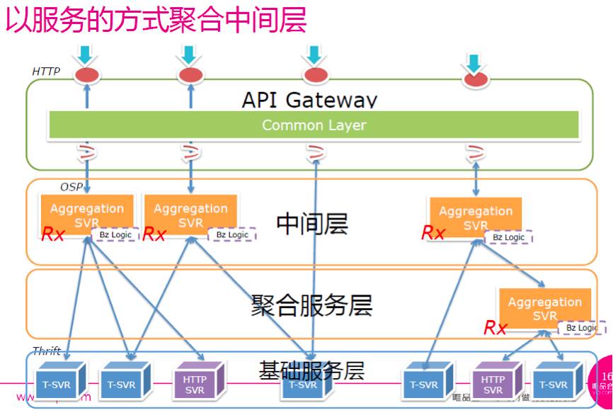 服务本身是零散化的东西,通常要接入的是中间层。实际上会在中间层做聚合,聚合层本身即可以做业务聚合,也可以做中间层的聚合,每一层的聚合都要做异步调用的设计。同时要对接口进行抽取,这样的话才能给 APP 使用。因为 APP 本身是没有服务发现的。