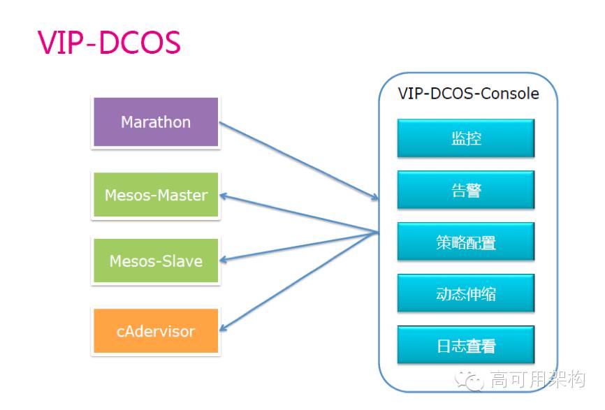 大家都很熟悉 DCOS,我们要做的事情就是基于 mesos + marathon 和 docker、cAdervisor 等组合成一个服务,包括实现我们自己的监控体系,还有策略的管理,包括弹性伸缩调度的能力,然后做一些预警,这些组件整合在一起,有一个独立的入口。