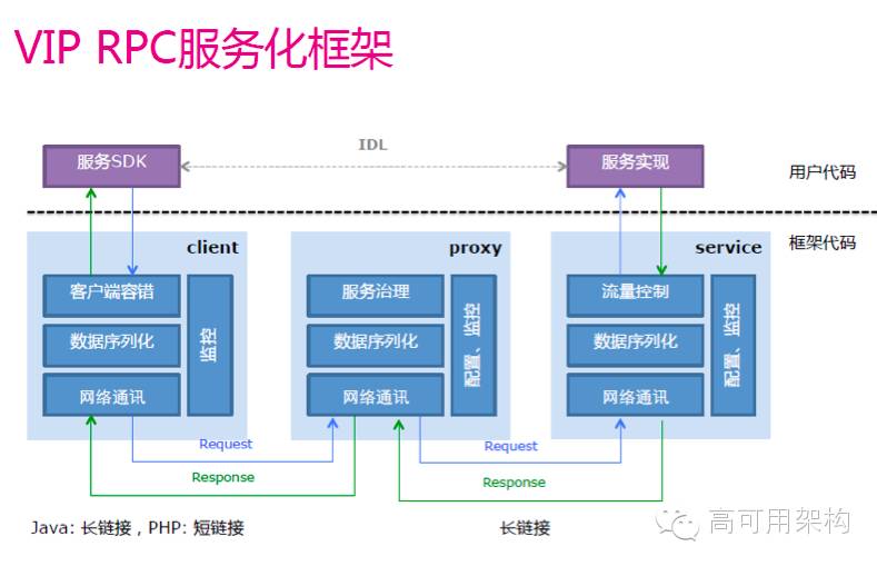 唯品会是自己构建的通信框架,基于 Thrift RPC 的方式。整个 RPC 框架分成三段:client、proxy,service。