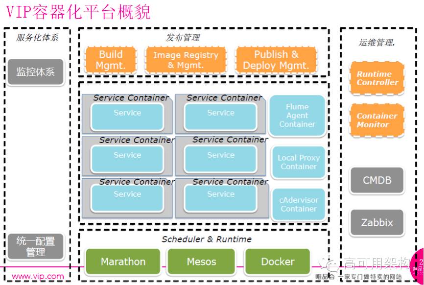下面是整个容器平台的概貌,左边服务化体系和监控体系,最右边是原有的物理机运维体系,这两个都可以直接沿用之前的系统,不需要太多调整。