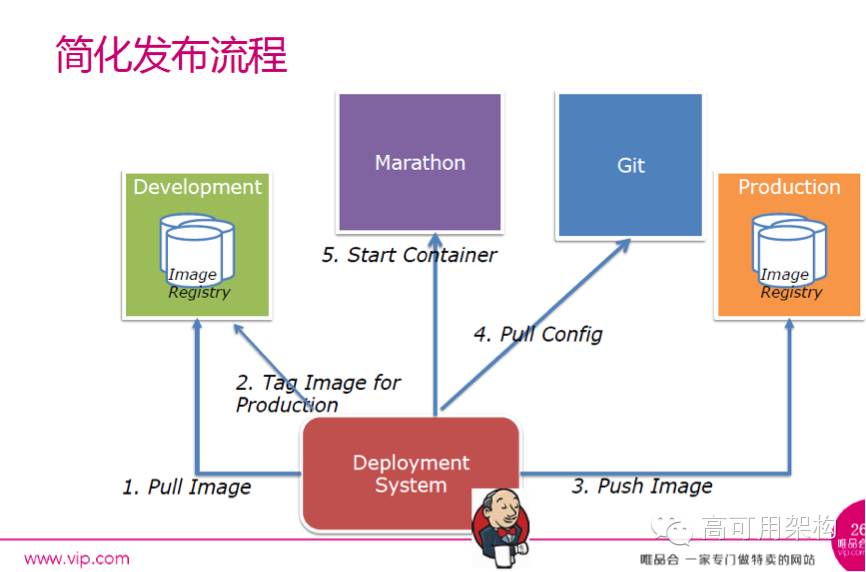 从发布的角度,要考虑怎么简单。我们做的简易化的发布,直接用 Registry + Jenkins 实现。大家只要在 Jenkins 写好脚本就可以了,这是一个简化的流程。不需要做代码开发。