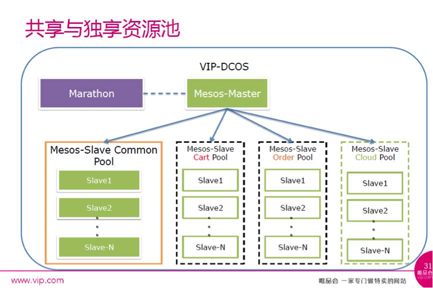 当然当大促的时候,我们会从公有池给它分额外的资源。将来继续演进,如果需要我们可以把它升级到公有云,把公有云机器变成 Mesos 的 slave 机器,把它挂到自己的集群里面,它就可以被调度了。