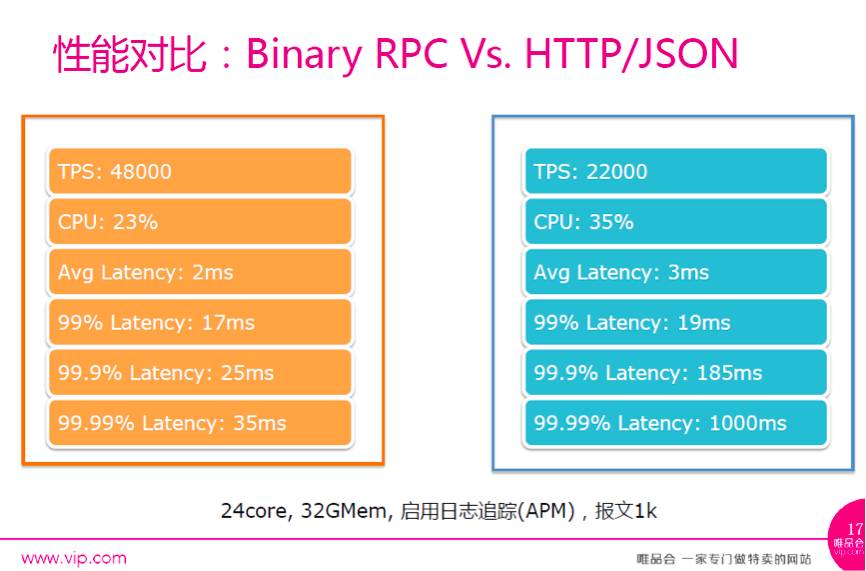 这是我们自己内部的一个简单的对比。我们会起用调用跟踪、写日志等,大概我们在 4.8 万 TPS,用 Tomcat Rest 方式压,可以到 2.4 万。