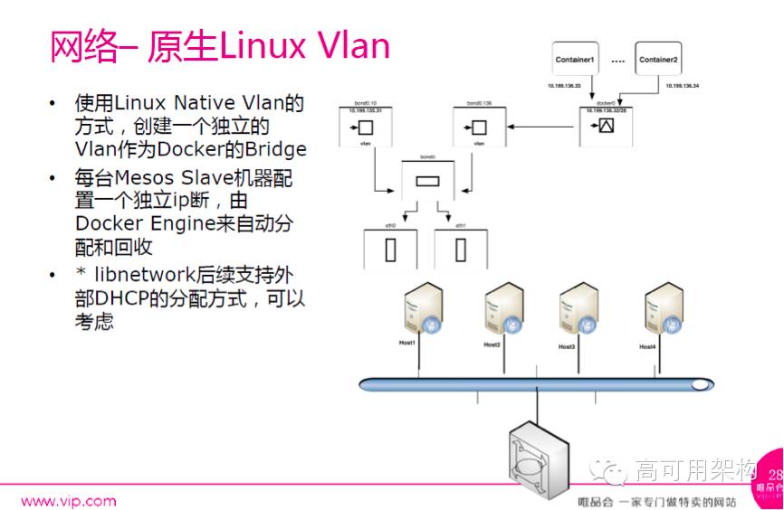 默认不管用 NAT 的方式还是 host 方式,它的管理始终是很麻烦。我还是希望 Marathon + Mesos 的方式不管网络,网络交给我们自己管。目前我的方式是每台机器用 Linux VLan 的方式。希望后续 libnetwork 可以支撑更好的 DHCP 的方式,目前还没考虑引入。