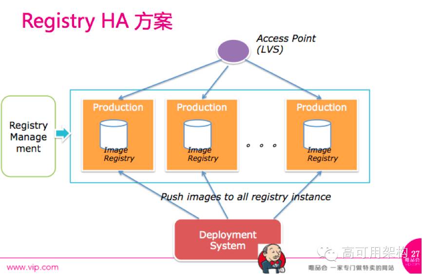 对于 Registry HA 方案,如果做一个类似于用分布式软件存储的方式,我不确定能不能做好管理。我们还是走最简单的方式,在 Jenkins 里面把它部署到多个 Registry 里。前面配置反向代理,让客户端可以访问到,这样容量就不会有问题。