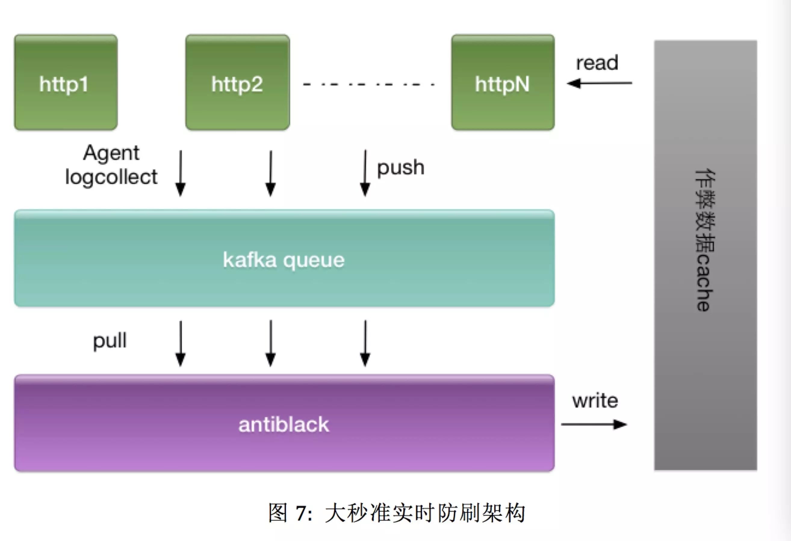 基于日志流的防刷架构,在每台 HTTP 节点上部署日志收集 Agent,使用高吞吐量的 Kafka 做日志转储队列,antiblack 模块实时分析用户请求日志,基于 IP 粒度、Uid 粒度等做防刷。