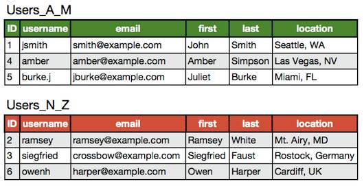 实际情况中往往会是垂直拆分和水平拆分的结合,即将Users_A_M和Users_N_Z再拆成Users和UserExtras,这样一共四张表