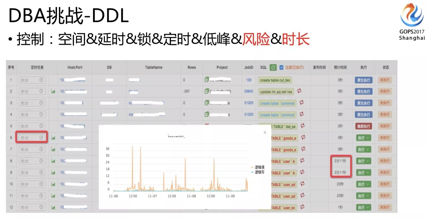 另外系统还可以通过识别业务高低峰推荐什么时候做DDL比较合适,还有一些风险识别的控制,我们还要预估DDL的时长,如果开发问一个500G的表DDL大概多久能做完?你需要能大概告诉他,给他一个预期。总之发布这块是我们面临最大的一个挑战,我们在上面做了很多工作。
