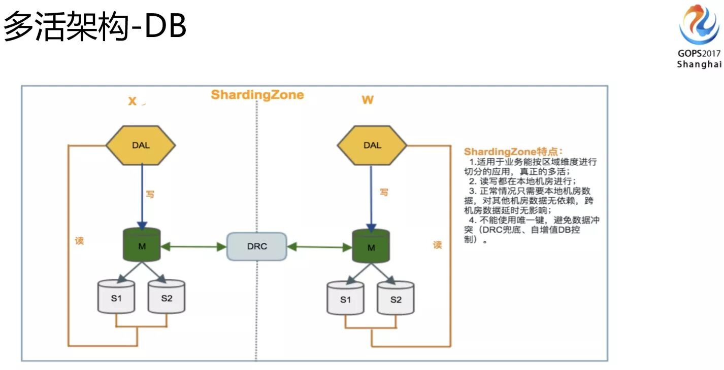 DB架构这块我们有两类(准确讲还有一类是多推的,比较少),第一类是ShardingZone,不管是数据写入还是访问都是本机房提供,出问题的时候也只是流量的切换,并不涉及到底层的变动,这个是真正多活的架构。