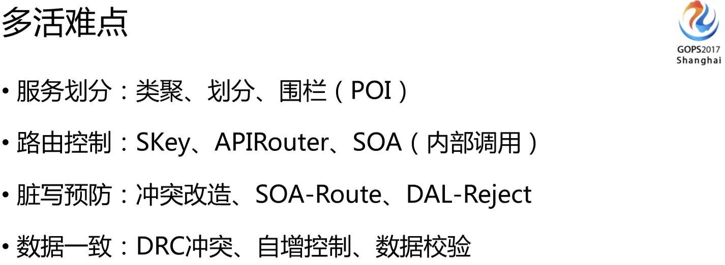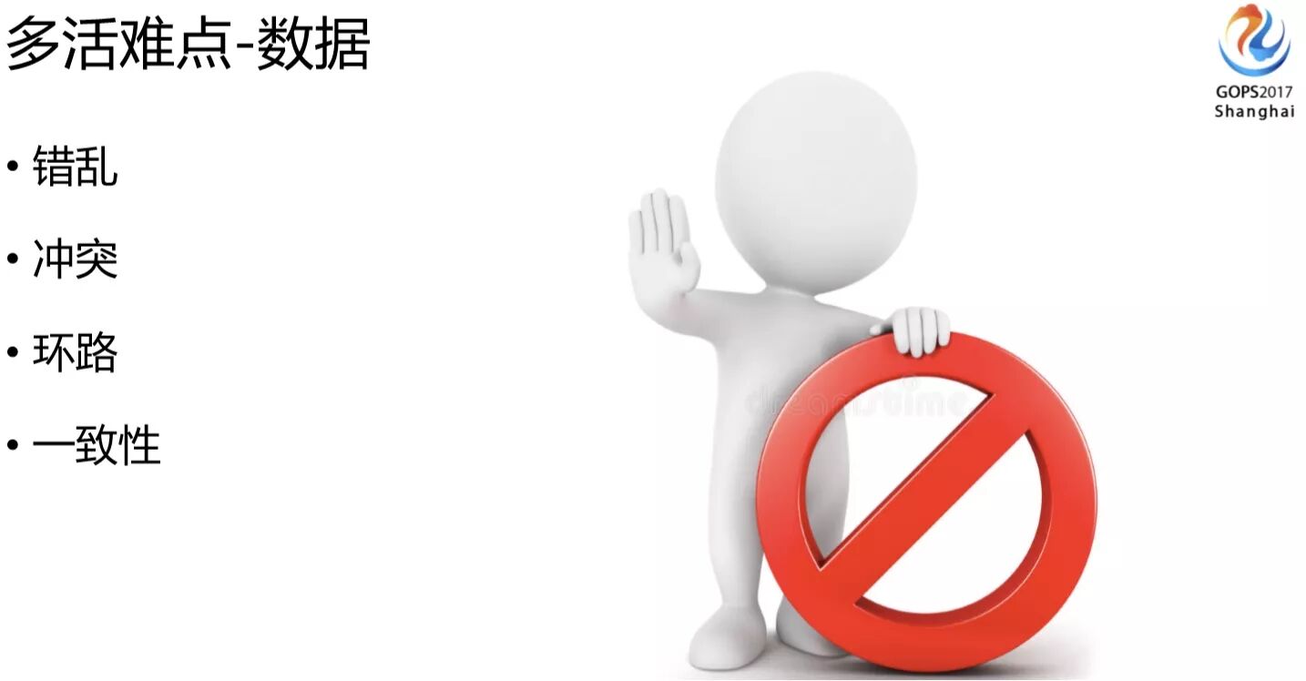 还有一个比较难的问题,就是怎么保证数据的安全。多活数据可能面临多个写入点,可能会错乱、会冲突、循环复制、数据环路等问题,这种情况下怎么保障一致性。如果这些没有考虑好之前,你是不能上多活方案的,多点写入的风险对数据的考验是很大的。
