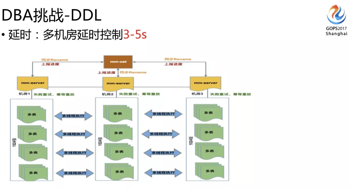 我们是多机房,多机房和你做一个机房的DDL时完全不一样的,因为你的机器可能有差异或者繁忙程度不一样,可能这个机房DDL做完了,另外一边要半小时之后才能做完,尤其是一个业务逻辑表的DDL对应的是上千张物理表的DDL时,差异性就更大了,这样造成的跨机房延时业务可能没法接受,所以我们需要的不仅是能保证同机房DDL主从延时的可控,还要保证跨机房的延时的可控。