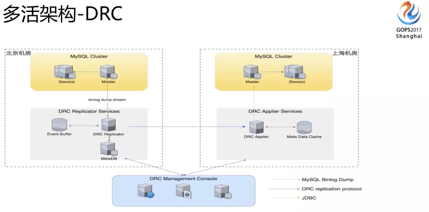 DRC这是做多活时相当重要的组件,主要解决数据在多个机房当中的同步复制。我们从北京机房写入的数据,会同步到上海的机房。上海的机房写入的数据也会通过DRC这个组件同步到北京的机房。大家可以看它其实包含三块服务,Replicator、Applier和Manager,一个收集变更数据、一个将变更数据写入到另一个机房,另外一个是做管理控制。