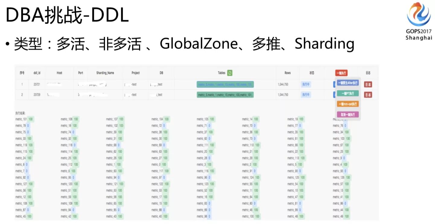 所以DDL需要DBA在每个机房单独做,我们开发了一套DDL发布工具。因为我们有很多数据类型,有GlobalZone还有shardingZone我们还有大量Sharding 表。对单个业务逻辑表的DDL来说,实际上我们一套集群里面有几百张表,这个表又分布在多套集群里面,所以实际业务一张逻辑表的DDL操作,实际DDL需要做一千张表,同时还有各种不同的业务集群类型,我们在发布工具必须要能自动适配和识别这些情况(这个时候元数据维护相当重要了,因为人已经识别不了啦,只能依靠工具)。