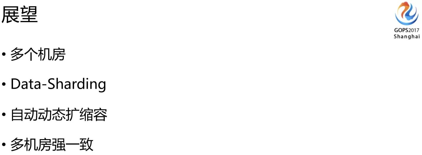 最后一个点是希望能够提供多机房数据强一致性的架构方案,因为我们现在来讲都是最终一致性的,怎么对一些非常重要的数据,提供各个机房数据及时强一致性,这块也是我们接下来需要努力的方向。