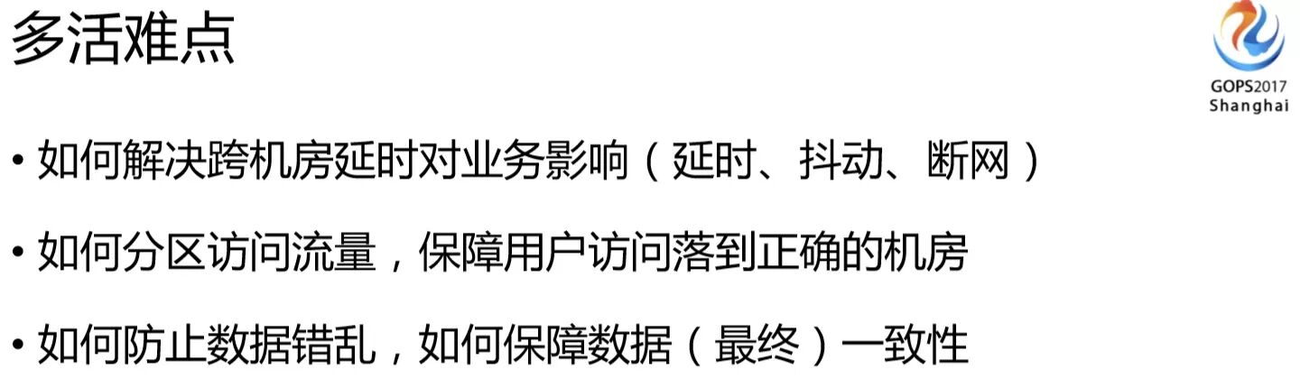 做多活之前,我们也面临过很多棘手的问题,比方我们之前面临着整个机房出现问题(核心交换机出问题、网络出问题),还有些机房因为在业务没有那么大之前你不可能预留特别多的机柜,但你现在说我业务涨的很快,现在要加一千台机器、两千台机器的时候,发现你加不了,因为你的IDC不能给你这个支持,他们不可能给你预留这么多机柜,这个时候你就面临单机房没法扩容的麻烦,之前只能考虑迁移到一个更大的机房去,但也是个耗时费力成本高的事情。