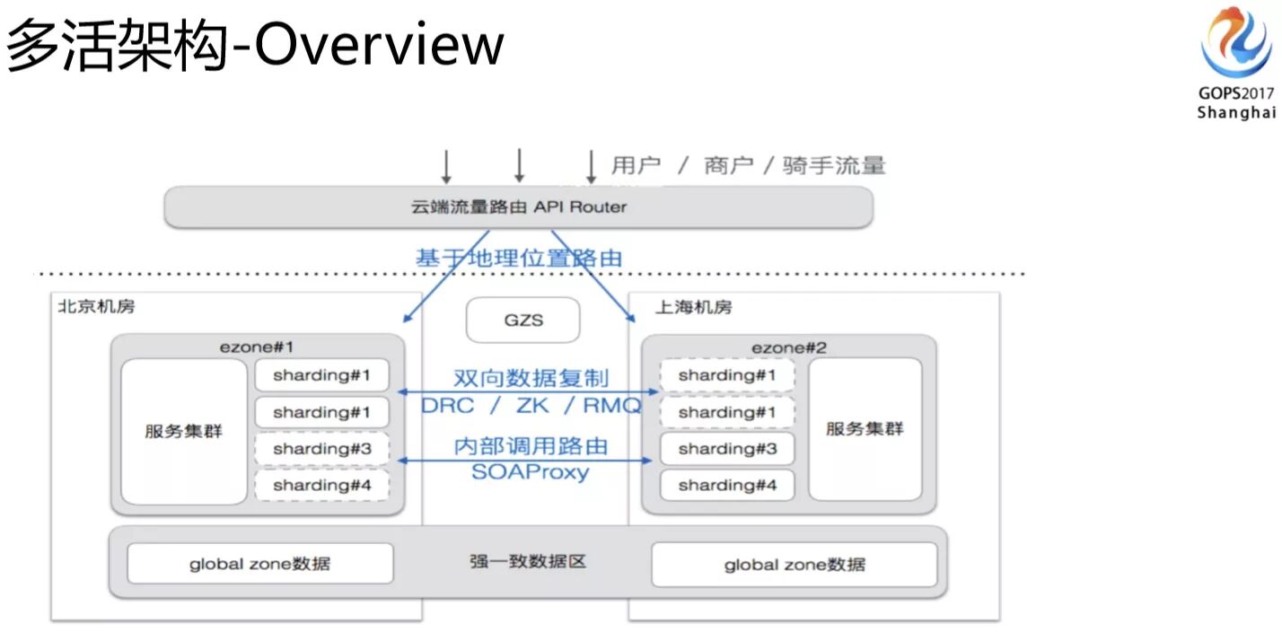 粗略过了多活的一些难点和我们的应对方案后,我们现在来看一下整个多活的架构。这个上面是我们从入口流量、分流控制、数据多机房同步,包括各个重要组件的架构等。还有里面有globol zone这一项,它是我们刚刚讲的需要全局依赖的业务会把它放在globol zone里面。