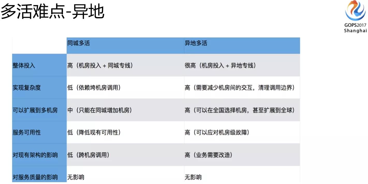 在可扩展性方面如果做的是异地多活的话,你的可扩展性理论上来说没有太多的边界。我们做同城多活只能在上海机房里面选,如果是异地多活,可能是全国甚至是全球都可以选。