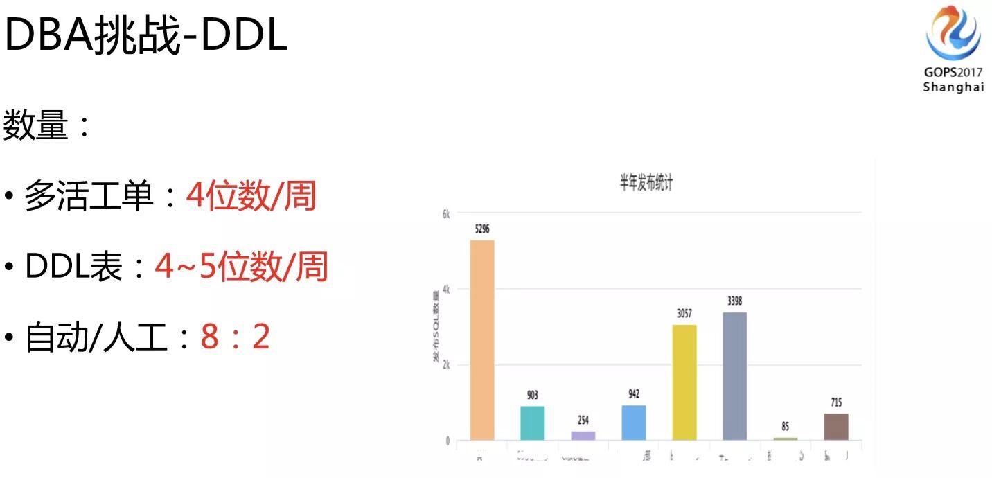 我们DDL数量相当多,可以说在多活改造的时候,DBA发布的量是最多的。多活改造期间我们DDL基本上每周的工单都在四位数,四位数的工单数量,放到底层来讲,可能一个逻辑表生成一千个DDL,就是最少是5位数DDL物理表的量了。